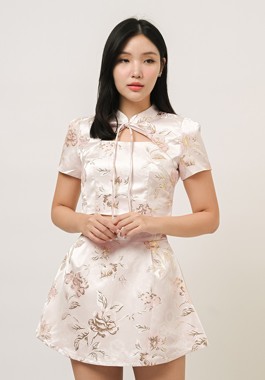 - Self-tied ribbon at front