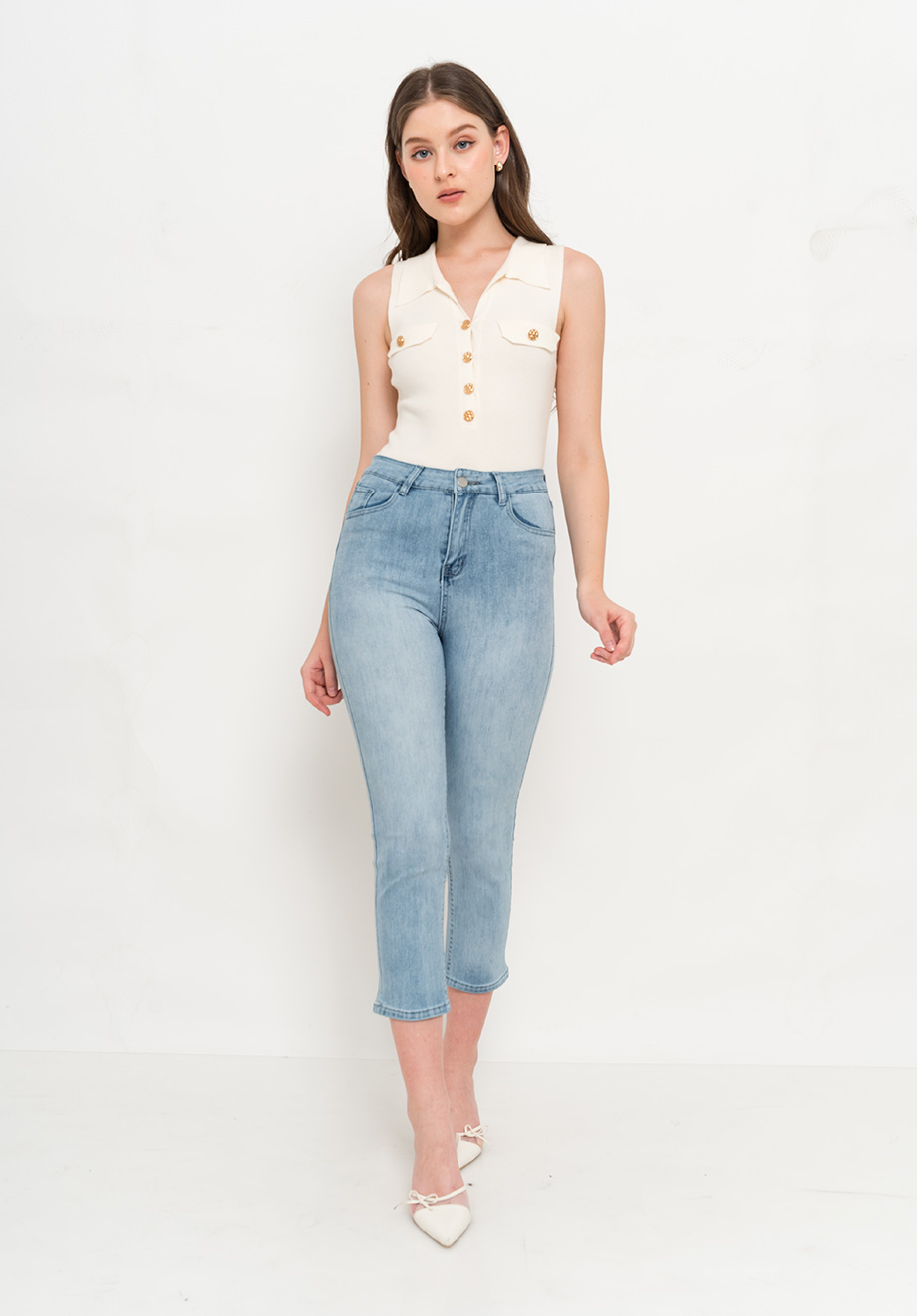 - Concealed front zipper and button for closure