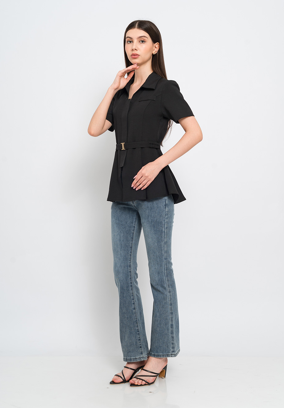 - Concealed front zipper for closure