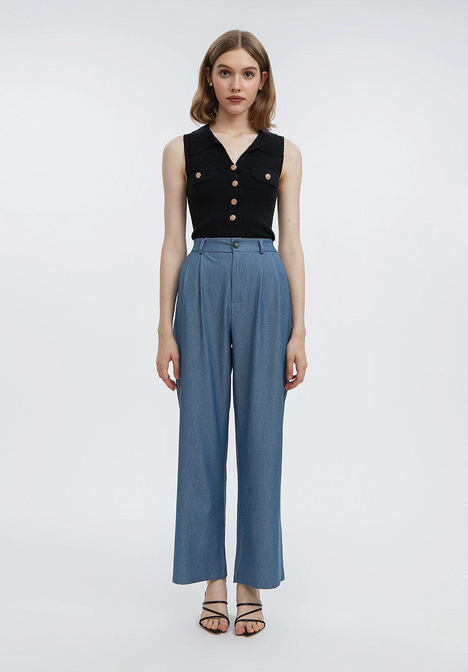- Concealed front zipper & button for closure